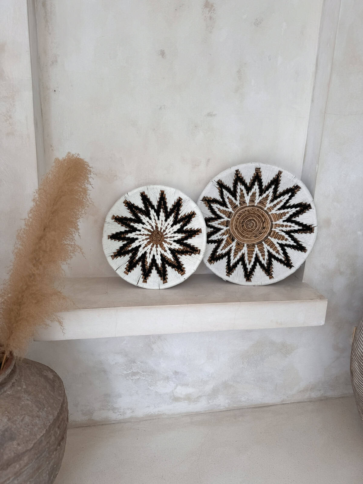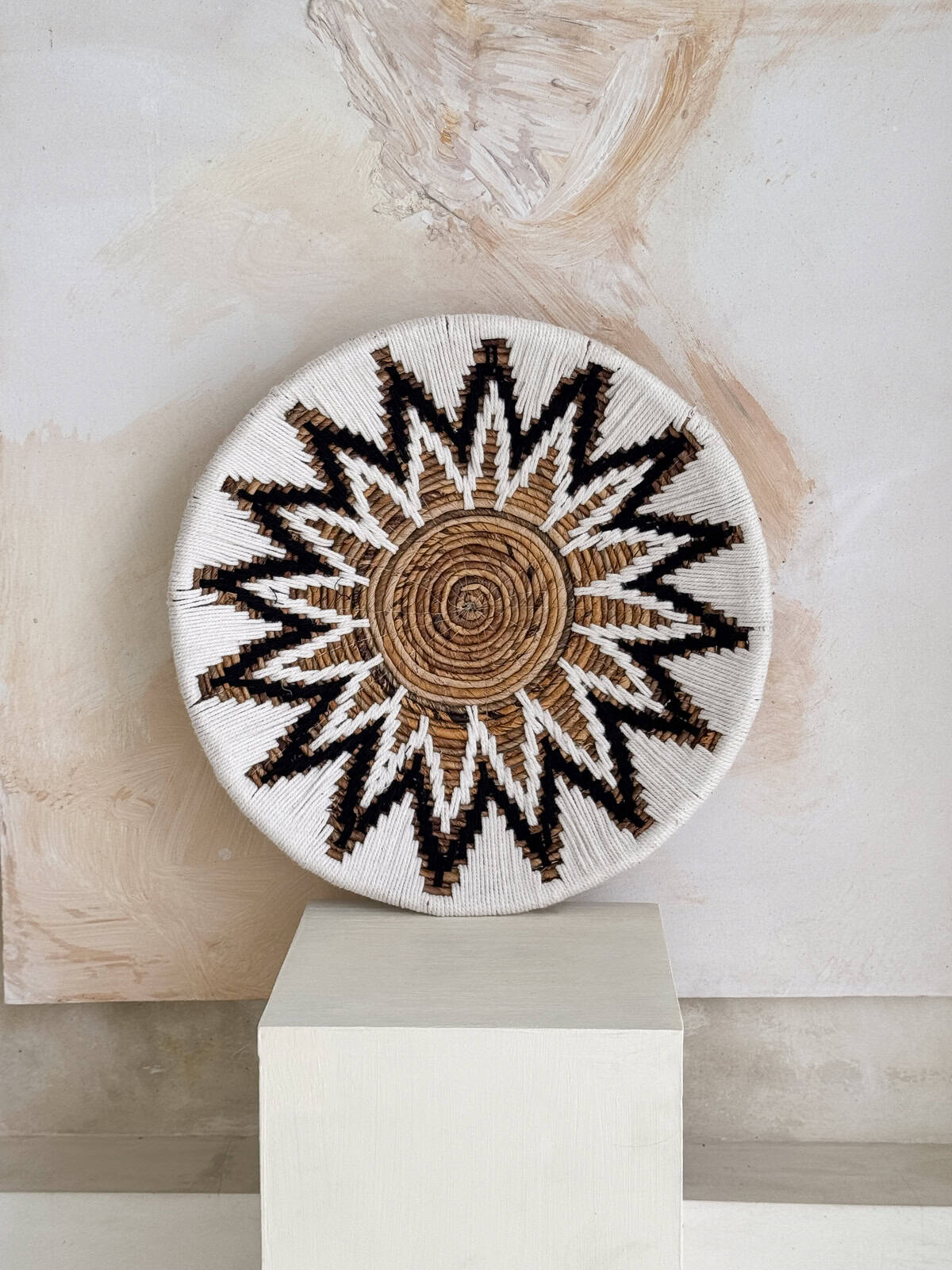 Die geflochtene, strahlenförmige Struktur aus heller Raphia und Baumwolle verleiht dem Raum Leichtigkeit und Tiefe. Mit ihrem Durchmesser von 50 cm wird sie zum stilvollen Mittelpunkt jeder Wand – ob im Wohnzimmer, Schlafzimmer oder über der Kommode.